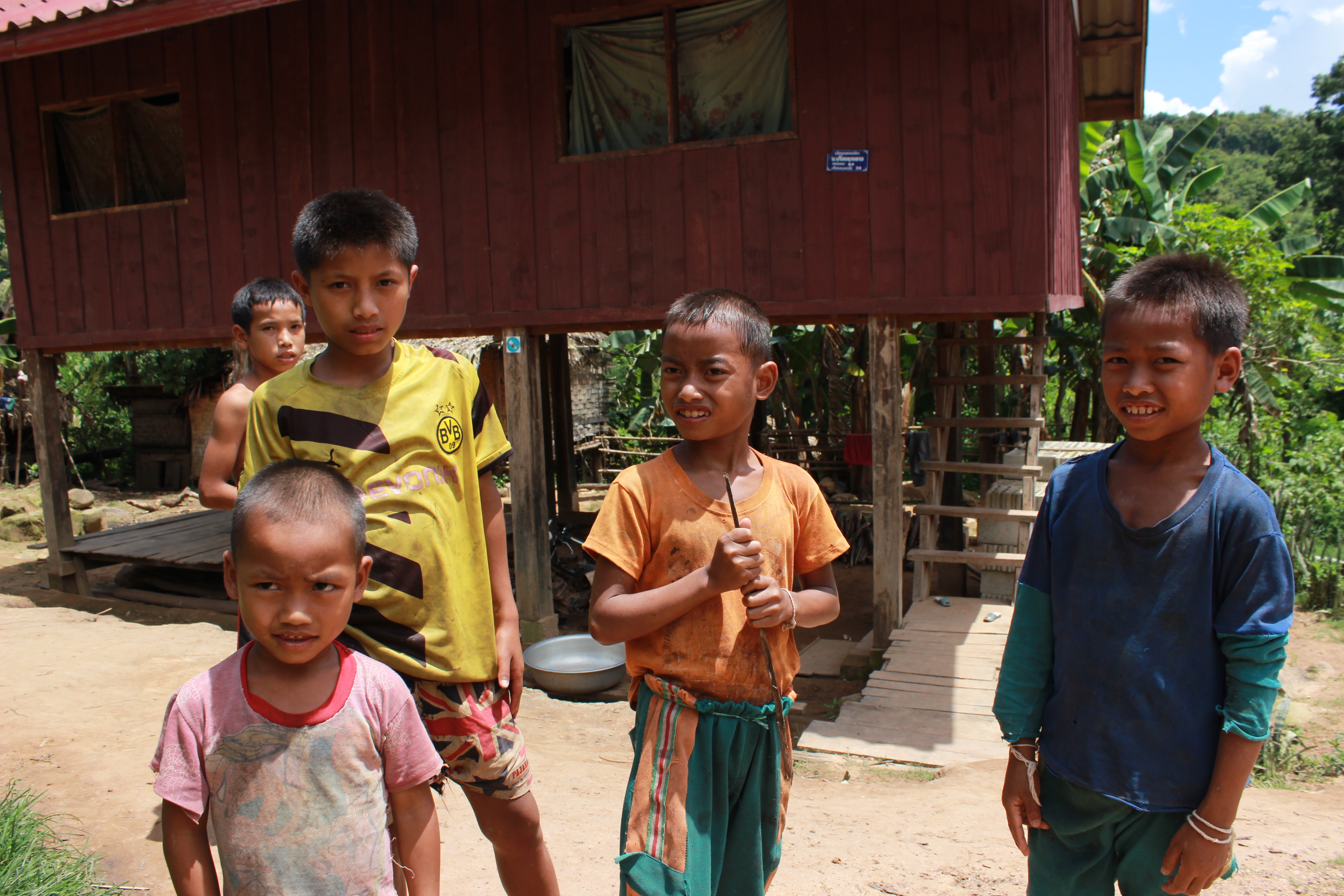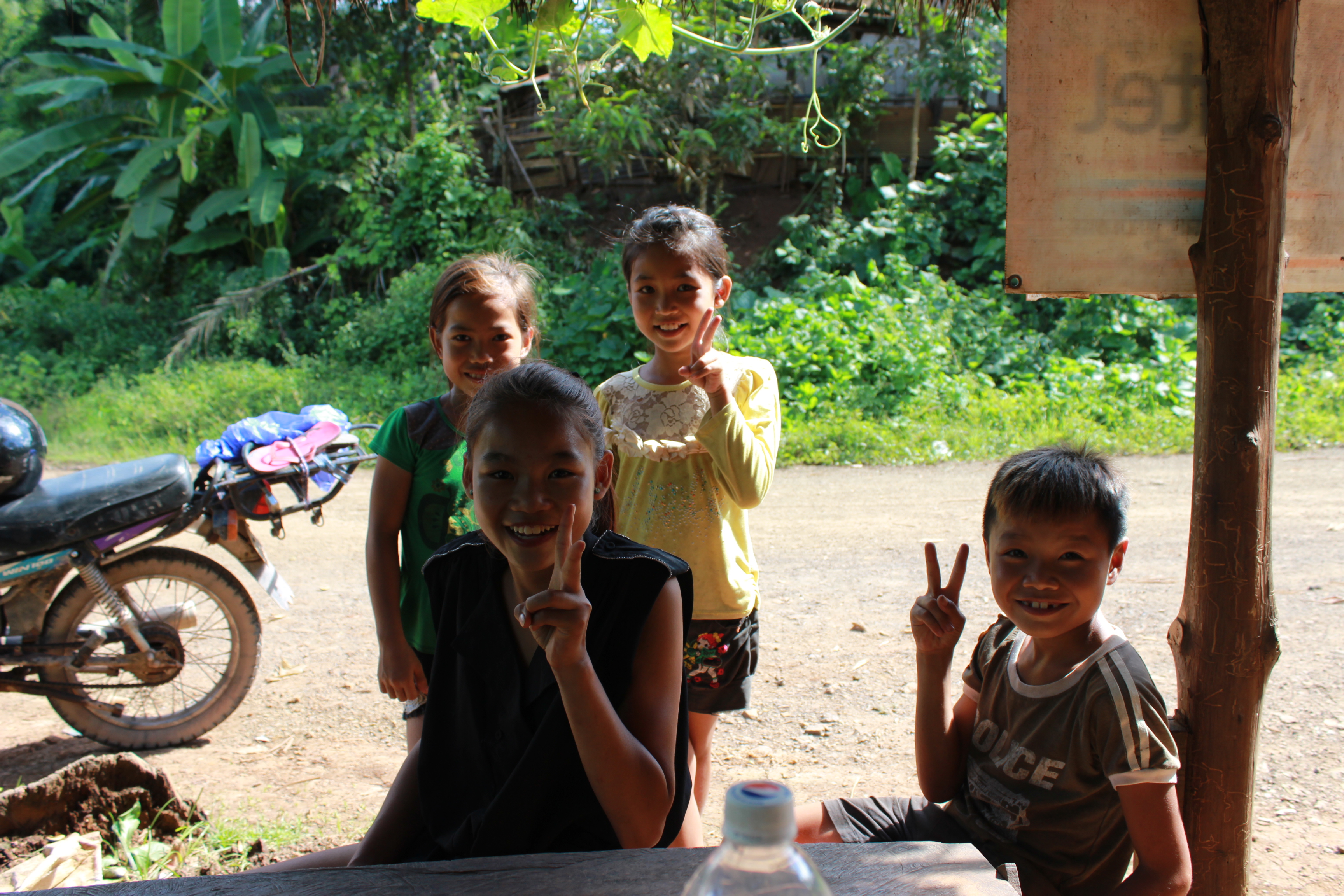 I made a few stops for pictures along the way because the scenery and villages were just too pure to not take a few photos. I was high in the green, lush mountains of northern Laos, and they extended as far as I could see. Many kids waved and said hello, while the adults (and definitely a few kids too) simply had blank expressions while their heads followed me as I passed. Near the end I walked my bike (and drove once or twice) through some 4 or 5 streams created by the rains, some almost knee deep. My bike always started back up. I was so on edge and focused, the time just passed by, though I barely made progress. I was riding a lot in 2nd gear, a little in 3rd, some in 1st, and barely any 4th the whole trip. At some steep slopes I was just barely making it up at full throttle in 1st gear. Down most hills, I was crawling in 2nd while hard on the break that barely worked, and sometimes even in 1st, with my balding back tire sliding around at times. Thankfully, I noticed the road started to level out towards the last section, and I was relieved. During the initial drive and the worst sections of road, clouds constantly gathered and dispersed, some dark and looking like they might bring rain. But they never did. And towards the end the sun shone bright and the clouds were few. I was relieved to say the least. But with better roads there was a constant rumbling and jolting against the stones that stuck above the dirt/mud surface, meaning it was a rough ride with very few smooth sections. On top of that loose stone chips covered the surface, to add an extra hazard. Near the end I stopped to have a break, buying a liter of fuel and a snack, and trying to talk to some locals and children.